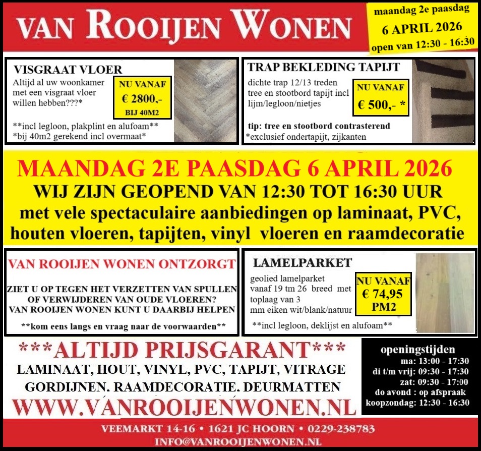 Sinds 1988 uw specialist in Noord Holland voor vloeren en raambekleding welke deskundig door eigen stoffeerders gelegd of gemonteerd worden. Ook zelf leggen behoort tot de mogelijkheden. Van Rooijen Wonen is dealer van alle bekende merken. Heeft u reeds een offerte mail ons uw offerte en laat u dan verrassen door onze lage prijzen. Nergens goedkoper en wij zijn prijsgarant*. Heeft u iets gezien dan kunnen wij vrijblijvend bij u langs komen (in ons werkgebied Noord Holland) met de staal om een passende offerte voor u te maken. Reserveren voor later zonder aanbetaling, ook voor de aanbiedingen, is geen probleem.