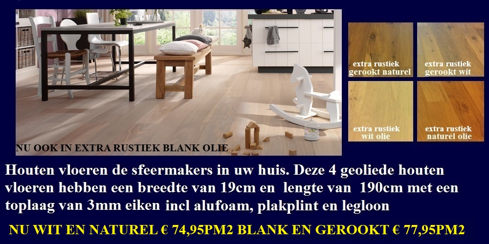 Dit is zomaar een greep uit ons uitgebreide collectie houten vloeren. Kom eens vrijblijvend langs om onze collectie houten vloeren te bekijken. Nergens goedkoper en wij zijn prijsgarant*. Reserveren voor later, ook voor aanbiedingen, is geen probleem. Voor het stofferen van houten vloeren is het niet noodzakelijk dat alle meubels verwijderd zijn uit de ruimte. Wij kunnen u ook helpen deze te verzetten en het verwijderen en afvoeren van oude vloerbedekking kunnen wij ook voor regelen. Alles is bespreekbaar.