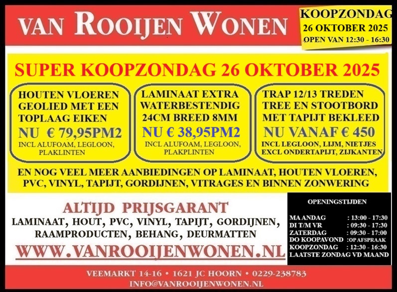 Sinds 1988 uw specialist in Noord Holland voor vloeren en raambekleding welke deskundig door eigen stoffeerders gelegd of gemonteerd worden. Ook zelf leggen behoort tot de mogelijkheden. Van Rooijen Wonen is dealer van alle bekende merken. Heeft u reeds een offerte mail ons uw offerte en laat u dan verrassen door onze lage prijzen. Nergens goedkoper en wij zijn prijsgarant*. Heeft u iets gezien dan kunnen wij vrijblijvend bij u langs komen (in ons werkgebied Noord Holland) met de staal om een passende offerte voor u te maken. Reserveren voor later zonder aanbetaling, ook voor de aanbiedingen, is geen probleem.